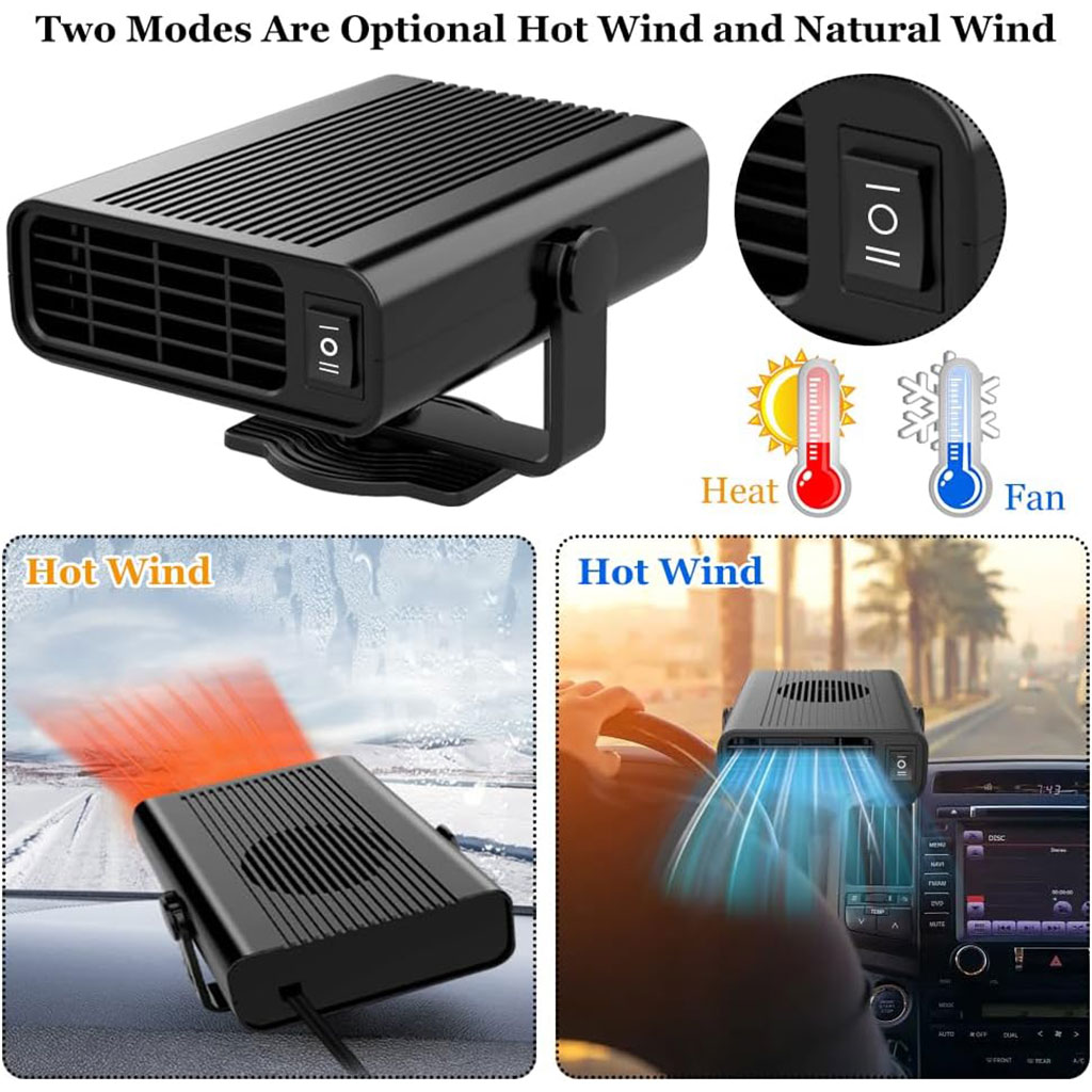 سخان وتبريد مزدوج الوظيفة : وضعان للهواء الساخن والبارد لتلبية احتياجاتك اليومية في كل الفصول.تسخين فوري وسريع : مزوّد بسلك تسخين من سبيكة مقاومة للأكسدة يضمن سرعة عالية في توليد الحرارة وعمرًا طويلاً.إزالة فعّالة للبخار والجليد : التصميم المجوّف في الأعلى يسمح بتدفّق هواء قوي يزيل الضباب والجليد عن الزجاج بسرعة.تصميم صغير ومبتكر : حجمه الصغير يسمح بوضعه في أي مكان داخل السيارة دون حجب الرؤية، ويمكن تثبيته بشريط لاصق مزدوج.قاعدة دوّارة 360° : لتوجيه الهواء في أي اتجاه تريده وتدفئة كل زاوية في السيارة.تشغيل سهل وهادئ : لا ضوضاء أثناء التشغيل، فقط قم بتوصيله في منفذ ولاعة السجائر 12V أو 24V واستمتع بالدفء.توفير الطاقة : استهلاك منخفض للكهرباء مع أداء فعّال لتسخين المقصورة وتنقية الهواء في نفس الوقت.⚙️ المواصفات التقنية :