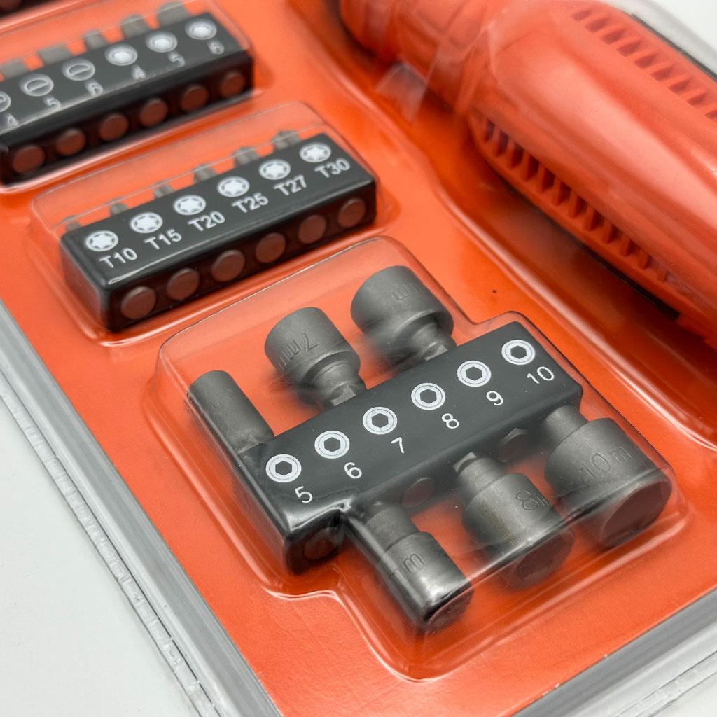 مصمم خصيصًا للمحترفين وعشاق الأعمال اليدوية. مصنوع من فولاذ الكروم فاناديوم (Cr-V) المعروف بصلابته العالية، هذا الطقم المكون من 25 قطعة يضمن لك أداءً موثوقًا وطويل الأمد في جميع أعمال الفك والربط.