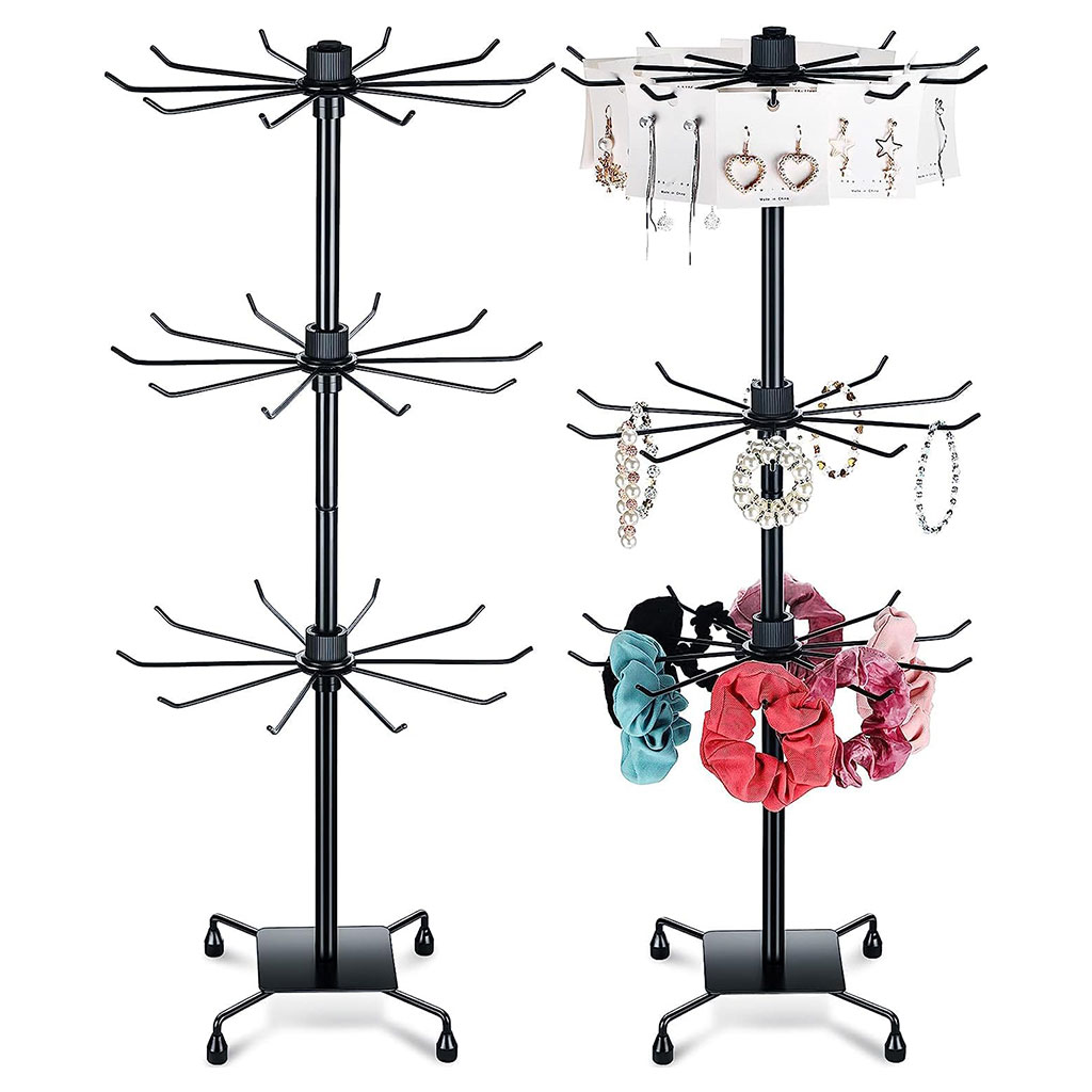 حامل مجوهرات بثلاث طبقات مزوّد بـ 10 خطافات دوّارة بزاوية كاملة 360 درجة، مثالي لتعليق الأقراط، الأساور، القلائد وغيرها.